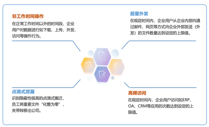 AiDLP數(shù)據(jù)防泄漏系統(tǒng)支持內(nèi)部風險人員行為監(jiān)測,包括對于嘗試隱藏、繞過或逃逸等行為進行發(fā)現(xiàn)和告警,通過采集和分析流量日志數(shù)據(jù),可及時檢測到非工作時間操作、高頻訪問、超量外發(fā)、點滴式泄漏等異常行為。