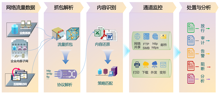 大流量場景下抓包及應用協(xié)議解析還原能力,是網(wǎng)絡DLP的關(guān)鍵基礎能力。安恒AiDLP在10Gbps流量環(huán)境下,具備全流量數(shù)據(jù)抓包分析能力。產(chǎn)品支持對HTTP、HTTPS、SMTP、POP3、IMAP、FTP、SMB、NFS等協(xié)議解析,對協(xié)議所承載的數(shù)據(jù)內(nèi)容進行還原,實現(xiàn)實時雙向流量的內(nèi)容審計。支持旁路、串接、Agent引流等多種部署模式,實現(xiàn)物理環(huán)境或者云環(huán)境下業(yè)務系統(tǒng)流量的靈活接入。