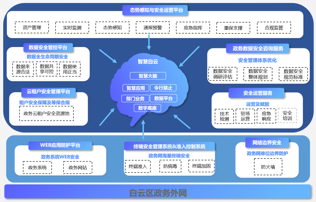 因此亟需開展“智慧白云”安全體系建設(shè)工作,需要統(tǒng)籌“智慧白云”各子系統(tǒng)架構(gòu)與數(shù)據(jù)的安全邊界,以“安全、合規(guī)、可控”為實現(xiàn)目標(biāo),從管理機制、技術(shù)保障、安全運營等角度去構(gòu)建立體化縱深防御體系,護航“智慧白云”體系和白云區(qū)政府?dāng)?shù)字化的健康發(fā)展。對此,安恒信息深度參與“智慧白云”安全體系建設(shè),共同筑牢白云區(qū)數(shù)字政府網(wǎng)絡(luò)安全防線。
