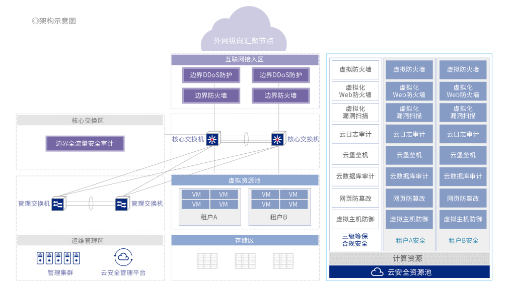 隨著運(yùn)營商云上業(yè)務(wù)增多,政企云上運(yùn)行的有機(jī)關(guān)部門和企業(yè)的業(yè)務(wù)應(yīng)用,一部分業(yè)務(wù)是面向互聯(lián)網(wǎng)公眾,一部分業(yè)務(wù)是面向單位各部門之間,所以首先符合國家相關(guān)信息安全政策和標(biāo)準(zhǔn),確保設(shè)計(jì)的政企云信息安全保障系統(tǒng)遵循國家法律且符合國家政策和國家標(biāo)準(zhǔn),滿足三級等保要求,是客戶迫切需要解決的問題,并且上運(yùn)營商政企云的各個租戶也越來越注重安全,本次項(xiàng)目安恒信息很好的解決了運(yùn)營商云平臺本身南北向以及各租戶之間東西向的安全問題。