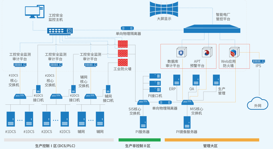 o?實(shí)現(xiàn)生產(chǎn)大區(qū)工控安全防護(hù) >>>>?在生產(chǎn)大區(qū)部署工控安全防護(hù)產(chǎn)品,提高工控系統(tǒng)在邊界隔離、入侵檢測及安全審計(jì)等方面的防護(hù)能力