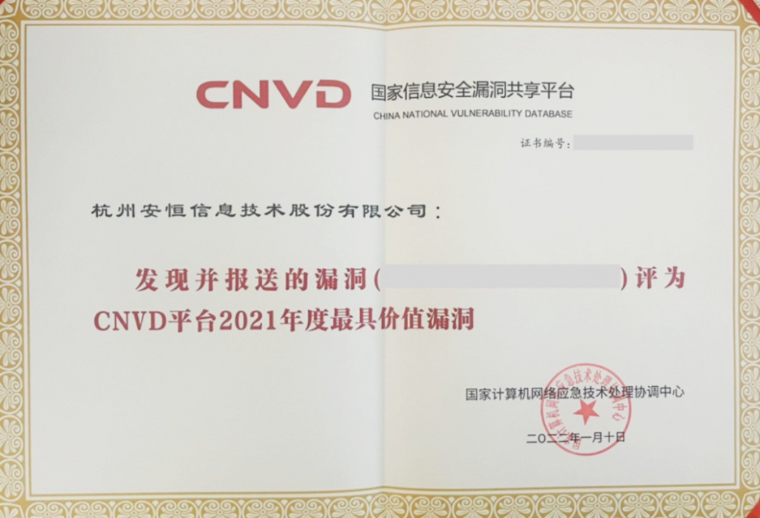CNVD為最具社會影響力的國家級漏洞庫,建立了安全漏洞的統(tǒng)一收集驗證、信息發(fā)布和應(yīng)急處置體系,在黨政機關(guān)和重要行業(yè)單位威脅預(yù)警、安全保障以及應(yīng)對大規(guī)模漏洞攻擊威脅、維護良好漏洞生態(tài)秩序方面發(fā)揮了重要作用。安恒信息早在CNVD成立之初,就是其最早的技術(shù)合作單位之一。此次CNVD授予4項榮譽,是對安恒信息在發(fā)現(xiàn)、收集、分析、報送、應(yīng)急處置安全漏洞這項專業(yè)實力的權(quán)威認可,同時也激勵著我們不斷開拓創(chuàng)新,提升網(wǎng)絡(luò)安全技術(shù)能力。