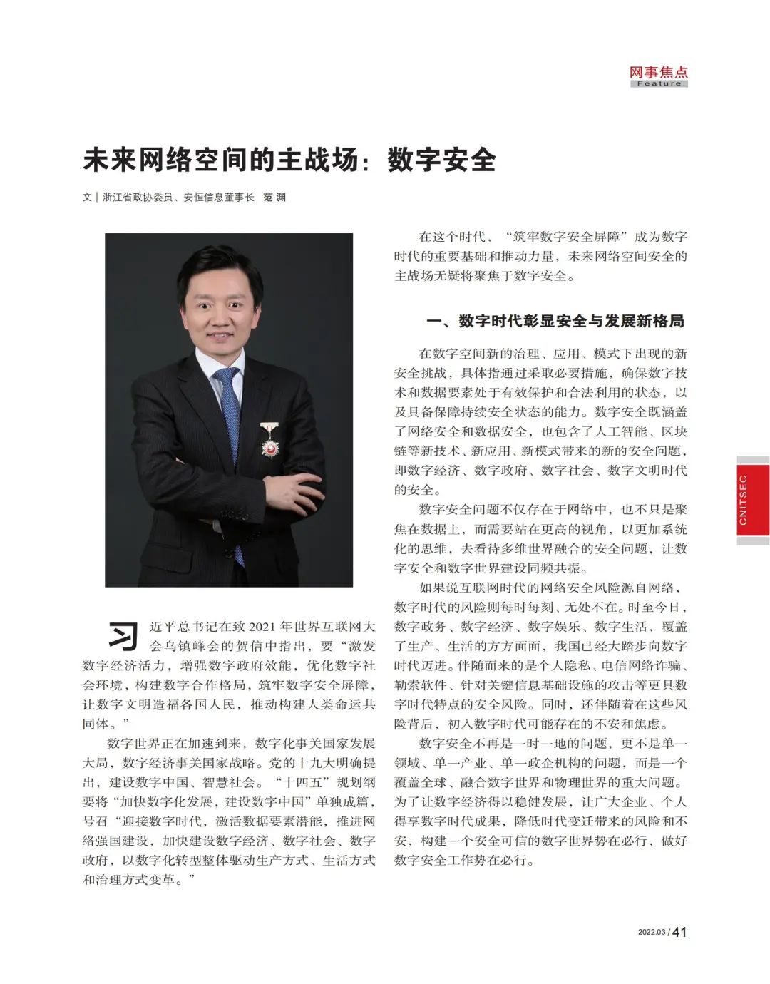 近日,中國信息安全雜志2022年第3期正式發(fā)布,浙江省政協(xié)委員、安恒信息董事長范淵題為《未來網(wǎng)絡(luò)空間的主戰(zhàn)場:數(shù)字安全》的文章收錄其中。