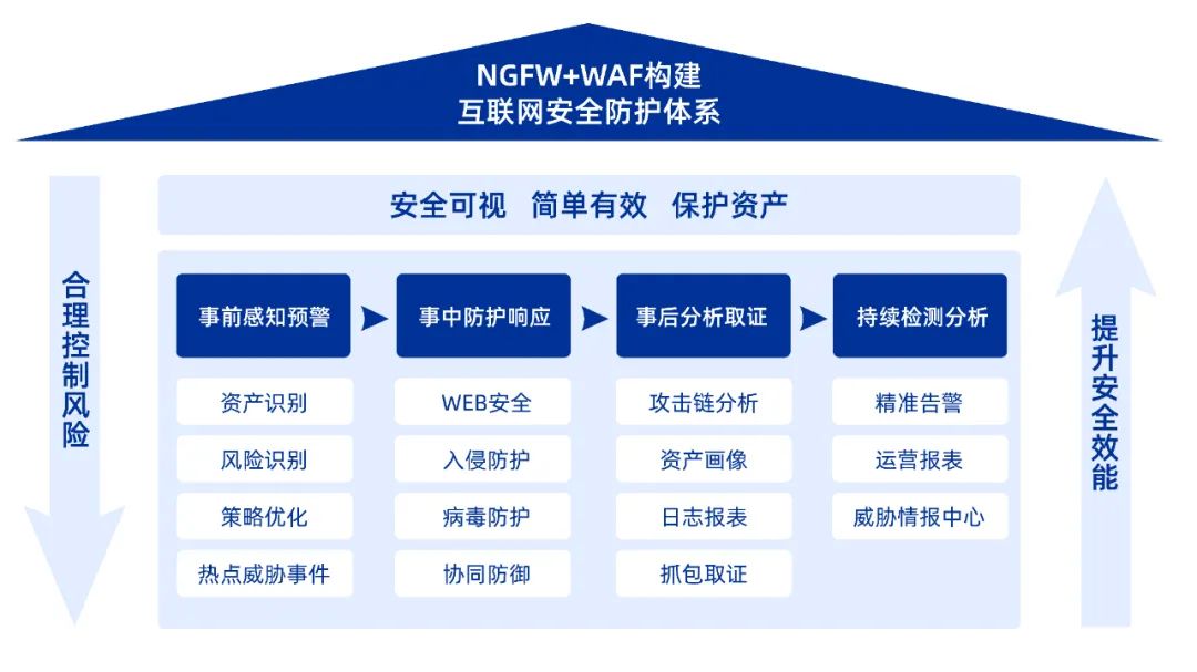 秉持安全可視、簡單有效的理念,互聯(lián)網(wǎng)出口安全檢測聯(lián)合解決方案通過明御安全網(wǎng)關(guān)與明御WEB應(yīng)用防火墻以資產(chǎn)為視角,構(gòu)建全流程防御的互聯(lián)網(wǎng)出口安全防護(hù)體系,并融合入侵防御、病毒防護(hù)、上網(wǎng)行為管控、VPN、威脅情報(bào)等安全模塊。