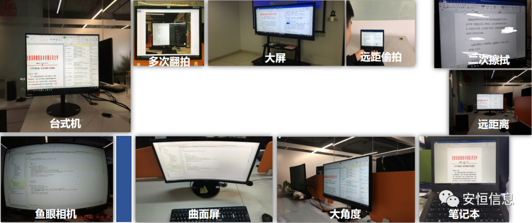 安恒EDR屏攝泄密溯源模塊具備極佳的魯棒性以及溯源的成功率,可針對(duì)臺(tái)式機(jī)、筆記本、顯示大屏、曲面屏、斜角度拍攝、魚眼相機(jī)拍攝、多次翻拍、遠(yuǎn)距離、部分屏、二次擦拭、圖片壓縮裁剪等多種環(huán)境進(jìn)行溯源取證。