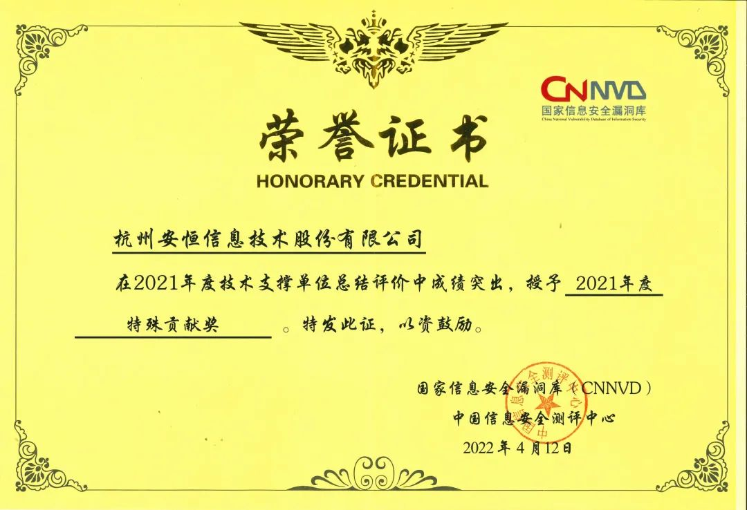 自2014年成為首批入選國家信息安全漏洞一級(jí)支撐單位的廠商以來,安恒信息積極為CNNVD提交重要數(shù)據(jù)漏洞,多年來,憑借實(shí)力和豐富經(jīng)驗(yàn)先后獲得來自CNNVD的多項(xiàng)榮譽(yù)。2021年,安恒信息榮獲CNNVD頒發(fā)的“2021年度特殊貢獻(xiàn)獎(jiǎng)”和“2021年度優(yōu)秀技術(shù)支撐單位”,不斷支持國家漏洞庫的建設(shè),助力信息安全漏洞研究。