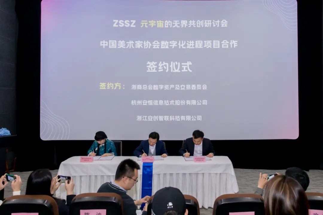 在元宇宙時代,文化藝術(shù)產(chǎn)業(yè)的發(fā)展將實現(xiàn)新的跨越。目前,元宇宙仍處于行業(yè)發(fā)展的初級階段,無論是底層技術(shù)還是應(yīng)用場景,與未來的成熟形態(tài)相比仍有較大差距,但這也意味著元宇宙相關(guān)產(chǎn)業(yè)可拓展的空間巨大?;顒又鬓k方以“無界共創(chuàng)”為題,組織杭州各界精英共同探討藝術(shù)與科技的創(chuàng)新融合,期待藝術(shù)在元宇宙時代創(chuàng)造全新的形態(tài),產(chǎn)生新的價值。主題研討后,中國美術(shù)家協(xié)會數(shù)字化進程項目合作簽約儀式、浙商總會數(shù)字資產(chǎn)及交易委員會時光會客廳授牌儀式相繼舉行。