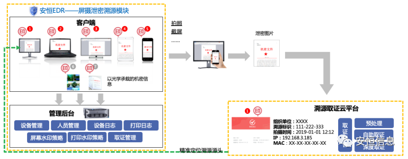 安恒信息明御®主機(jī)安全及管理系統(tǒng)(EDR)屏攝泄密溯源模塊,可對(duì)終端設(shè)備(PC、筆記本電腦、智能手機(jī)、大屏等)的屏幕顯示進(jìn)行拍攝溯源管理。系統(tǒng)實(shí)時(shí)將不可見(jiàn)的安全標(biāo)識(shí)信息隱藏于終端設(shè)備的屏幕中,對(duì)截屏或拍屏的文件進(jìn)行提取,即可獲得該安全標(biāo)識(shí)信息,精準(zhǔn)定位截屏或拍屏源頭。