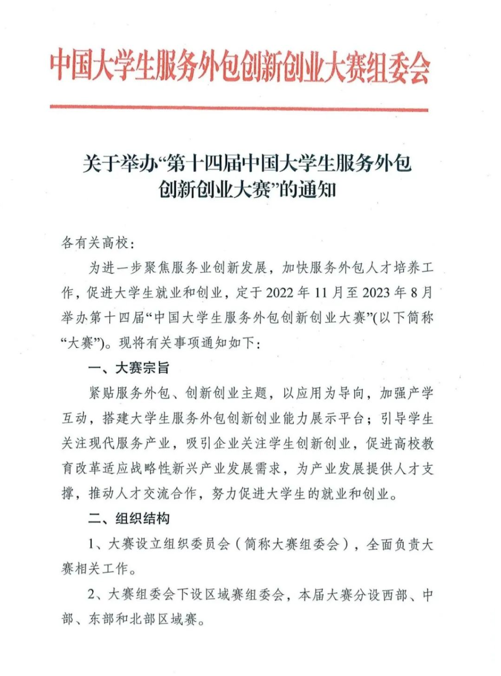 為進一步聚焦服務(wù)業(yè)創(chuàng)新發(fā)展,加快服務(wù)外包人才培養(yǎng)工作,促進大學(xué)生就業(yè)和創(chuàng)業(yè)。第十四屆大學(xué)生服務(wù)外包創(chuàng)新創(chuàng)業(yè)大賽于2022年11月21日正式開賽!