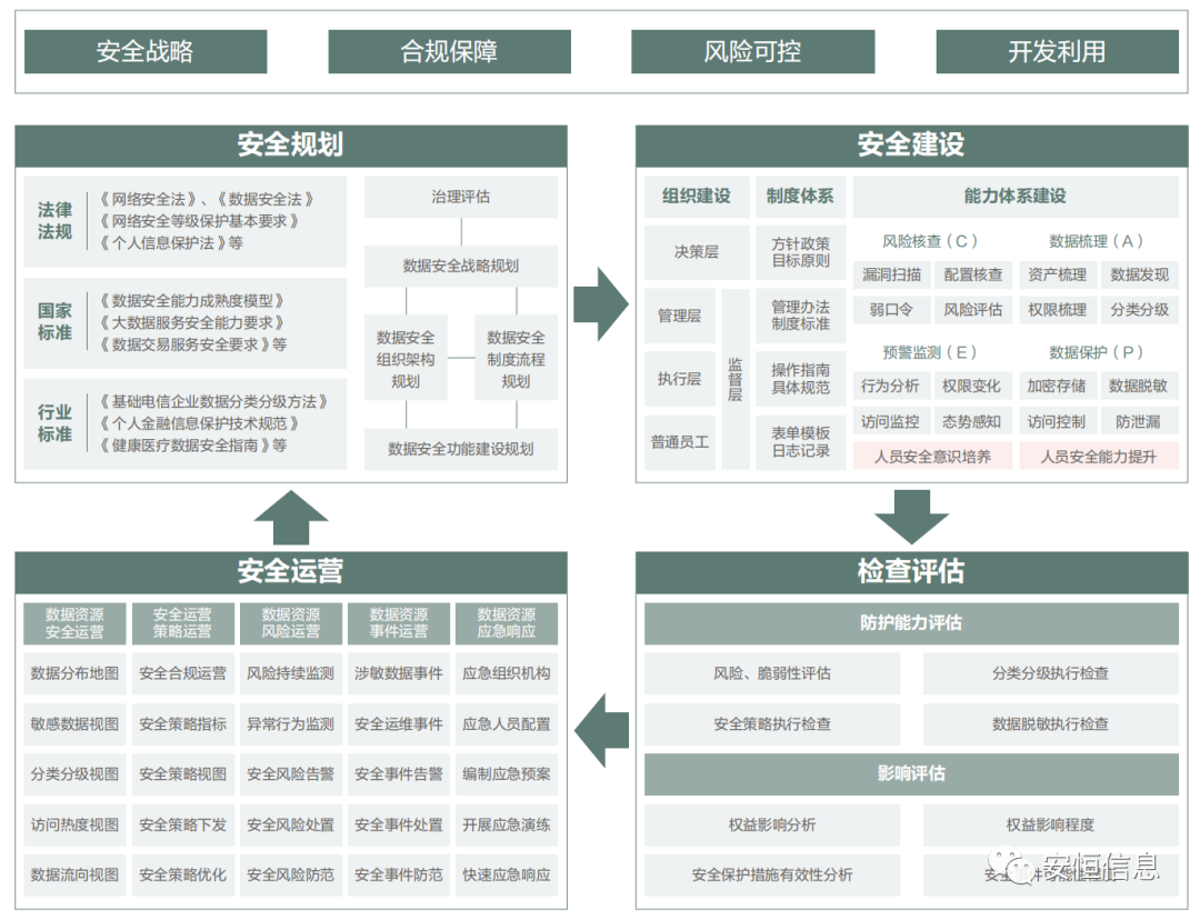 安恒信息數(shù)據(jù)安全治理體系框架包含:安全規(guī)劃、安全建設(shè)、檢查評(píng)估和安全運(yùn)營(yíng)四個(gè)方面。