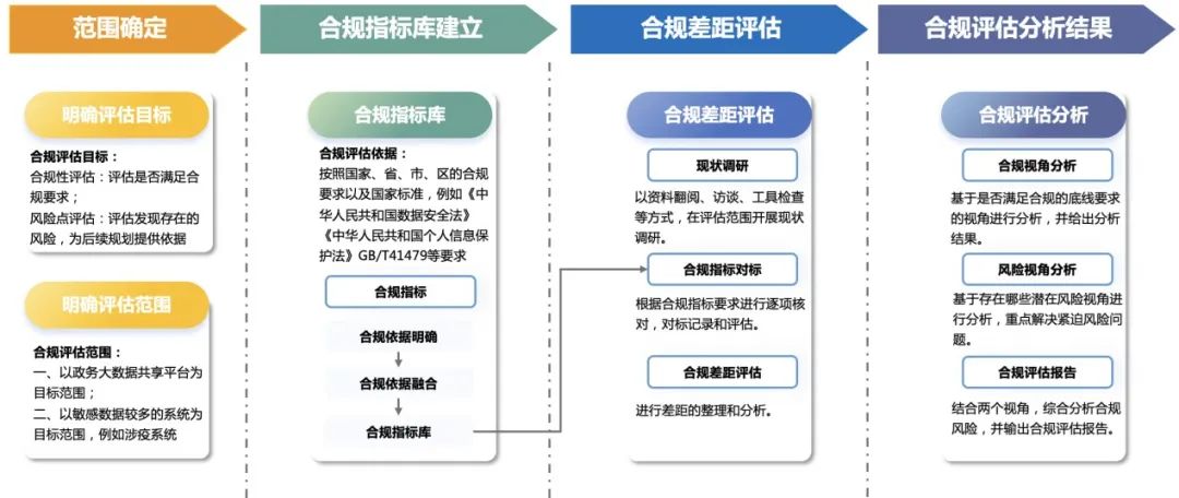 政務(wù)行業(yè)數(shù)據(jù)體量大,且數(shù)據(jù)敏感程度較高,所以開展數(shù)據(jù)安全工作需要以咨詢的角度切入,開展數(shù)據(jù)安全評估,基于評估的結(jié)果進(jìn)行數(shù)據(jù)安全體系化規(guī)劃,此路徑經(jīng)實踐檢驗,科學(xué)有效,可操作性強。數(shù)據(jù)安全合規(guī)評估以業(yè)務(wù)系統(tǒng)為單位,確定合規(guī)評估的范圍,明確合規(guī)評估的依據(jù),形成合規(guī)指標(biāo),開展差距分析,并形成合規(guī)評估報告。