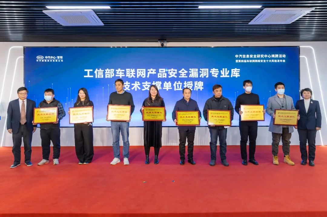 近日,中汽信息安全研究中心揭幕儀式暨第四屆車聯(lián)網(wǎng)網(wǎng)絡(luò)安全十大風(fēng)險(xiǎn)發(fā)布會(huì)在津成功舉行。會(huì)上同步舉行了工信部車聯(lián)網(wǎng)產(chǎn)品安全漏洞專業(yè)庫(kù)技術(shù)支撐單位授牌表彰儀式, 安恒信息憑借在車聯(lián)網(wǎng)安全領(lǐng)域領(lǐng)先的技術(shù)實(shí)力和漏洞領(lǐng)域突出的行業(yè)貢獻(xiàn)成功入選。工業(yè)和信息化部網(wǎng)絡(luò)安全管理局局長(zhǎng)隋靜和中汽中心黨委委員、副總經(jīng)理吳志新共同為車聯(lián)網(wǎng)產(chǎn)品安全漏洞專業(yè)庫(kù)技術(shù)支撐單位授牌。
