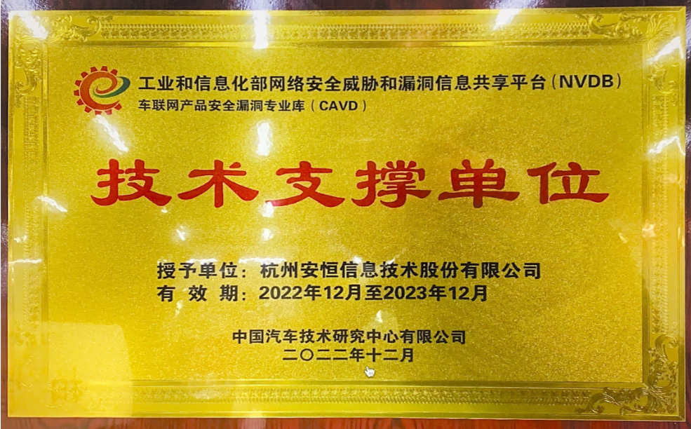 安恒信息入選工信部車聯(lián)網(wǎng)產(chǎn)品安全漏洞專業(yè)庫(kù)技術(shù)支撐單位