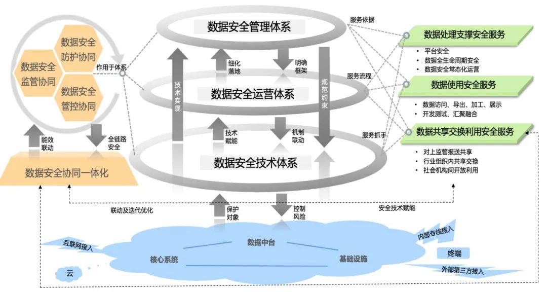 自數(shù)據(jù)安全體系化治理概念推出以來,安恒信息一直在實踐中不斷更新迭代方法論,從“前期-數(shù)據(jù)安全頂層規(guī)劃、中期-數(shù)據(jù)安全治理落地、后期-數(shù)據(jù)安全持續(xù)運營”三段論中提煉出更具象化的、落地性質(zhì)的咨詢理念,圍繞數(shù)據(jù)安全防護、管控、監(jiān)管三大協(xié)同一體化機制,作用于數(shù)據(jù)安全管理、運營、技術三大體系架構,延伸出數(shù)據(jù)處理支撐、使用、共享交換利用三大安全服務領域,持續(xù)為客戶提供管理抓手、技術賦能、運營聯(lián)動,保障全鏈路全場景的數(shù)據(jù)安全。