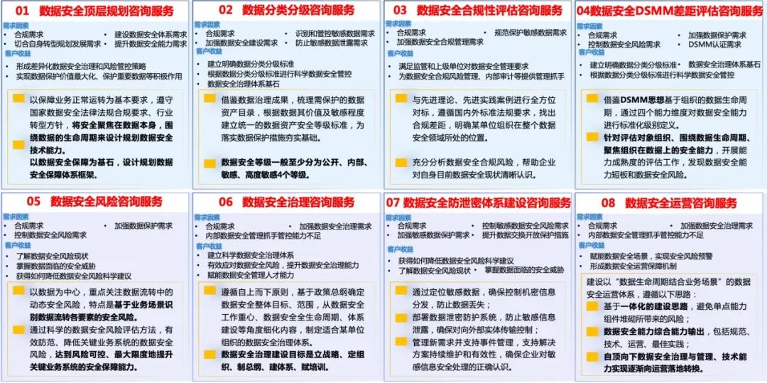 安恒信息數(shù)據(jù)安全咨詢服務體系自發(fā)布以來,旨在深度參與客戶數(shù)據(jù)安全體系規(guī)劃、建設落地到運營的全過程,持續(xù)提升數(shù)據(jù)安全能力成熟度水平,其完整的主線可以概括成“設目標、定框架、數(shù)分類、數(shù)分級、看現(xiàn)狀、識風險、立制度、設策略、制架構、落能力、融流程、驗效果”。可提供的核心服務包括八大類:數(shù)據(jù)安全頂層規(guī)劃、分類分級、合規(guī)評估、DSMM差距評估、風險評估、治理咨詢、防泄密體系、運營體系設計咨詢服務。?