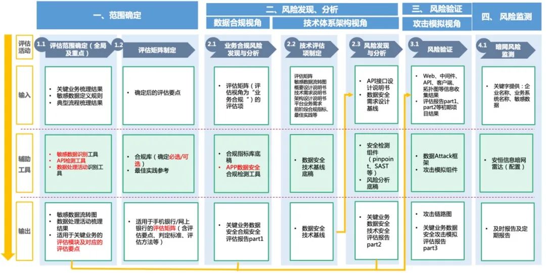 安恒信息結合金融、運營商等重點行業(yè)內(nèi)客戶真實技術需求,利用已有技術、服務、工具等,內(nèi)部進行多次專題研討開發(fā),總結出基于業(yè)務場景的數(shù)據(jù)安全風險評估落地方法思路。??