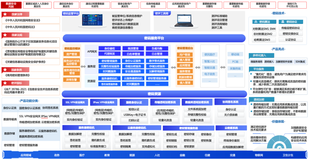 圍繞密評標(biāo)準(zhǔn)、打造以密碼服務(wù)平臺與監(jiān)管平臺為支撐的國密產(chǎn)品體系;助力客戶高分通過密評;打通密碼服務(wù)平臺與各產(chǎn)品的聯(lián)動、可管、可檢測、可監(jiān)管。
