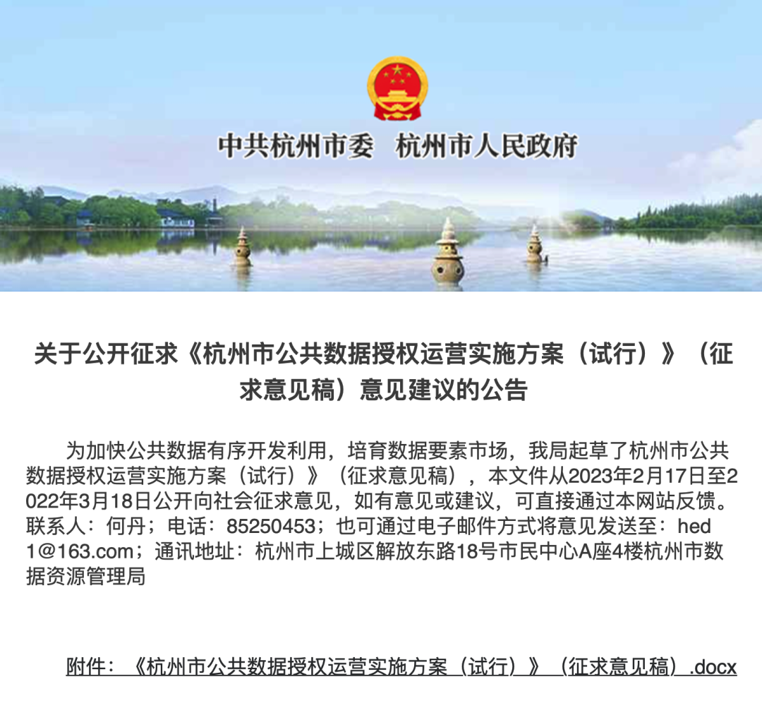 2023年2月17日,杭州市數(shù)據(jù)資源局通過政府官網(wǎng)發(fā)布了 《杭州市公共數(shù)據(jù)授權(quán)運(yùn)營實(shí)施方案(試行)》(征求意見稿),公開向社會征求意見。
