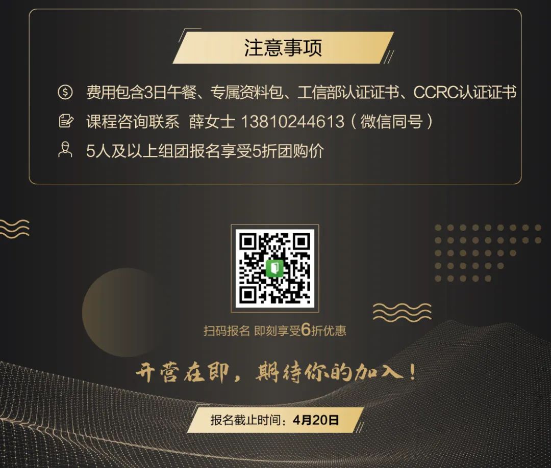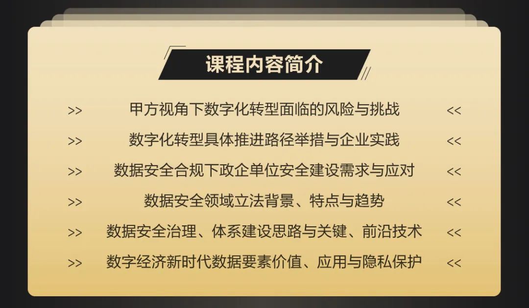 數(shù)字安全官高級研修班課程框架包括5大主題,10塊課程安排,培訓對象為黨政軍企網(wǎng)絡安全工作的主管領導或主要負責人,旨在提升他們的網(wǎng)絡安全建設戰(zhàn)略思路與實踐能力,限制30人。所有授課結(jié)束后將進行學員交流分享+講師點評并做評優(yōu)。此外,還會建立學員交流群,講師入群,隨時互動。
