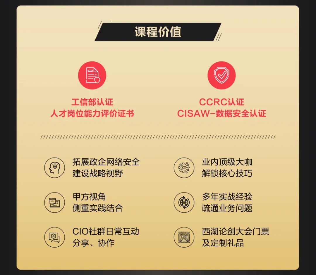 西湖論劍安全特訓營共設有兩大特色課程:數(shù)字安全官高級研修班和網(wǎng)絡攻防藍隊實戰(zhàn)技法提升計劃。2月22日,數(shù)字安全官高級研修班正式啟動報名。