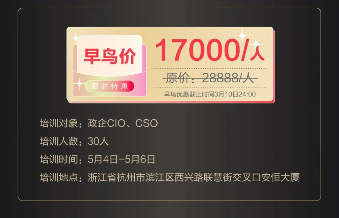 西湖論劍安全特訓營在2023年西湖論劍·網(wǎng)絡安全大會期間將通過線下授課方式開展場景化培訓。你可能學過很多的CSO理論,但從來沒有見過這么多的實戰(zhàn)干貨;你可能參加過很多的CSO培訓,但從來沒有見過如此完整的CSO路徑;你可能認識很多CSO的朋友,但從來沒有聽過這么掏心掏肺的分享。在數(shù)字時代下,我們賦予CSO全新定義“數(shù)字安全官”。首期數(shù)字安全官高級研修班3天課程驚艷來襲。