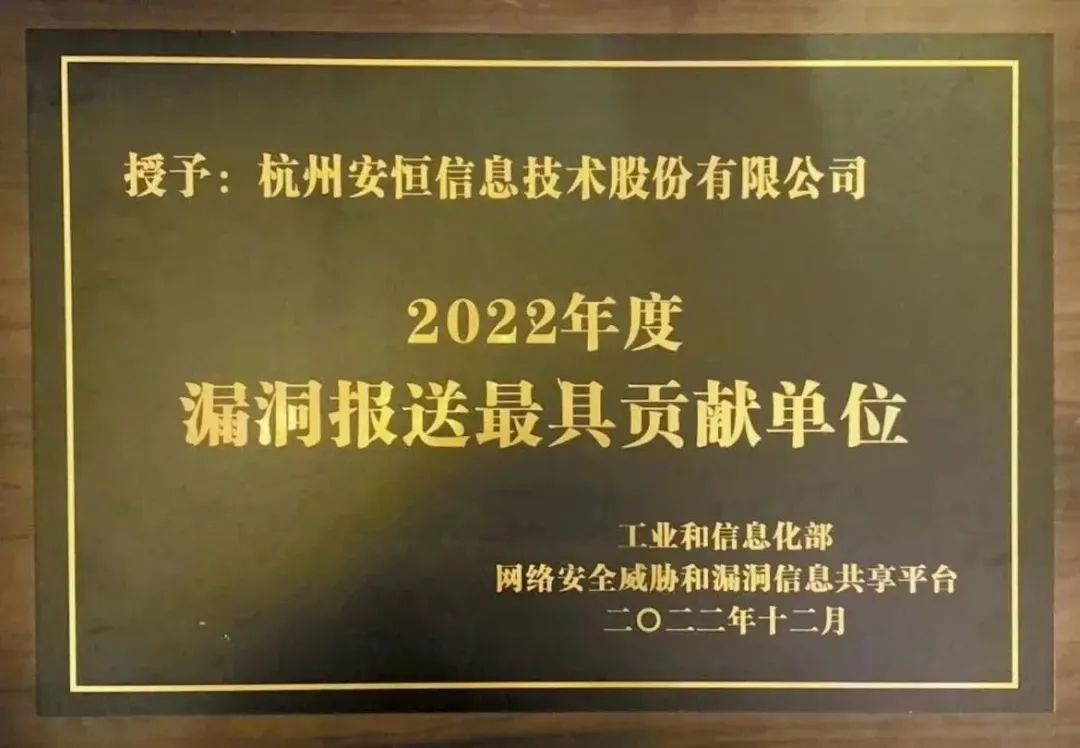 同時(shí),安恒信息還被工業(yè)和信息化部、網(wǎng)絡(luò)安全威脅和漏洞信息共享平臺(tái)授予“2022年度漏洞報(bào)送最具貢獻(xiàn)單位”榮譽(yù)。