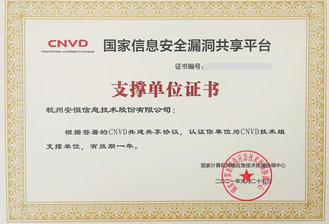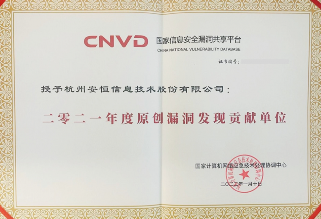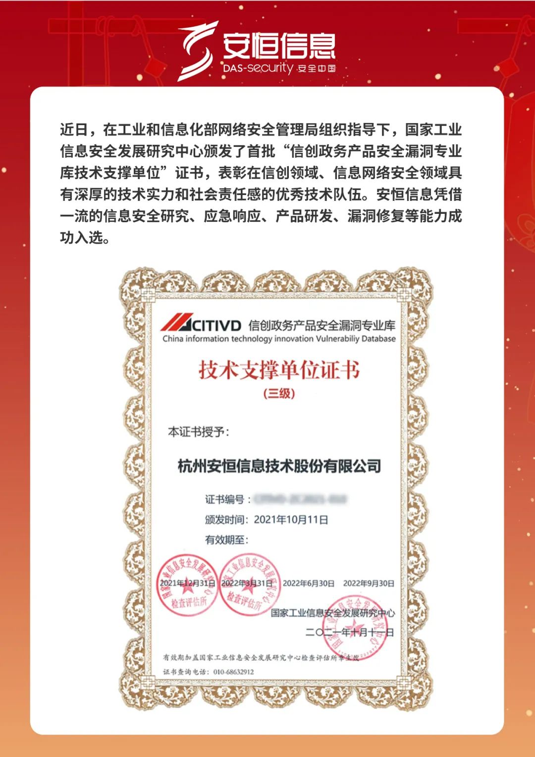 憑借在信創(chuàng)領(lǐng)域領(lǐng)先的漏洞發(fā)現(xiàn)、分析、處置能力,安恒信息先后榮獲國家信息安全漏洞共享平臺(CNVD)頒發(fā)的2021年度“原創(chuàng)漏洞發(fā)現(xiàn)貢獻(xiàn)單位”、“技術(shù)組支撐單位”稱號,自主發(fā)現(xiàn)的某漏洞獲評“最具價值漏洞”;榮獲國家信息安全漏洞庫(CNNVD)頒發(fā)的“技術(shù)支撐單位”證書;安恒信創(chuàng)云安全解決方案榮獲由國家工業(yè)信息安全發(fā)展研究中心頒發(fā)的“2021年信息技術(shù)應(yīng)用創(chuàng)新安全優(yōu)秀解決方案”。