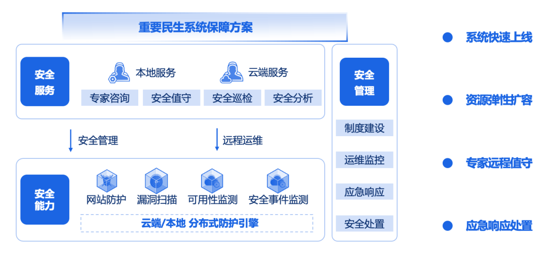 重要民生系統(tǒng)保障方案采用先進的SaaS化技術,主動出擊,持續(xù)地監(jiān)測系統(tǒng)狀態(tài),從容應對各類潛在的安全威脅和高并發(fā)訪問,保障重要民生系統(tǒng)安全穩(wěn)定運行。