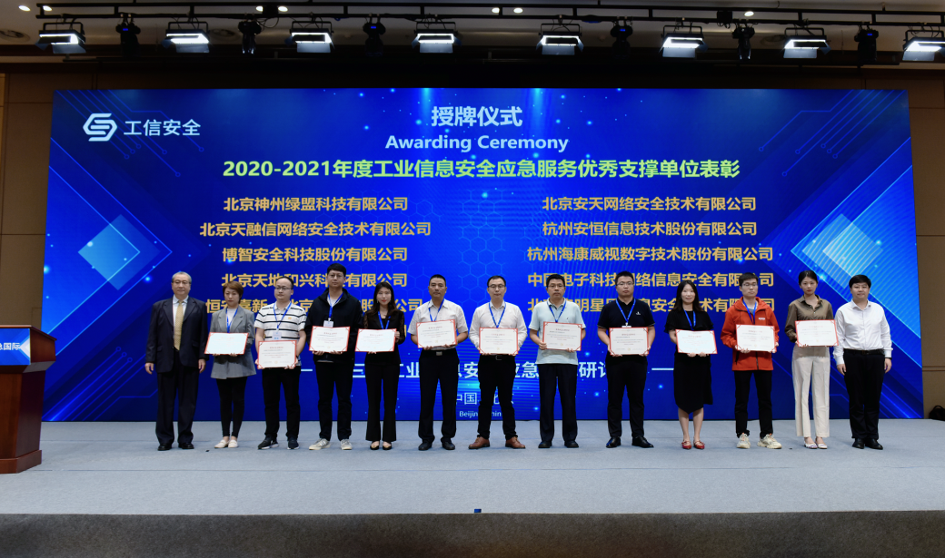 2020-2021年度工業(yè)信息安全應(yīng)急服務(wù)優(yōu)秀支撐單位(左五為安恒信息)