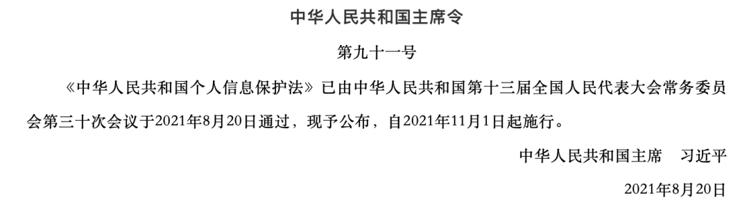8月20日,十三屆全國人大常委會第三十次會議表決通過《中華人民共和國個人信息保護法》,自2021年11月1日起施行。