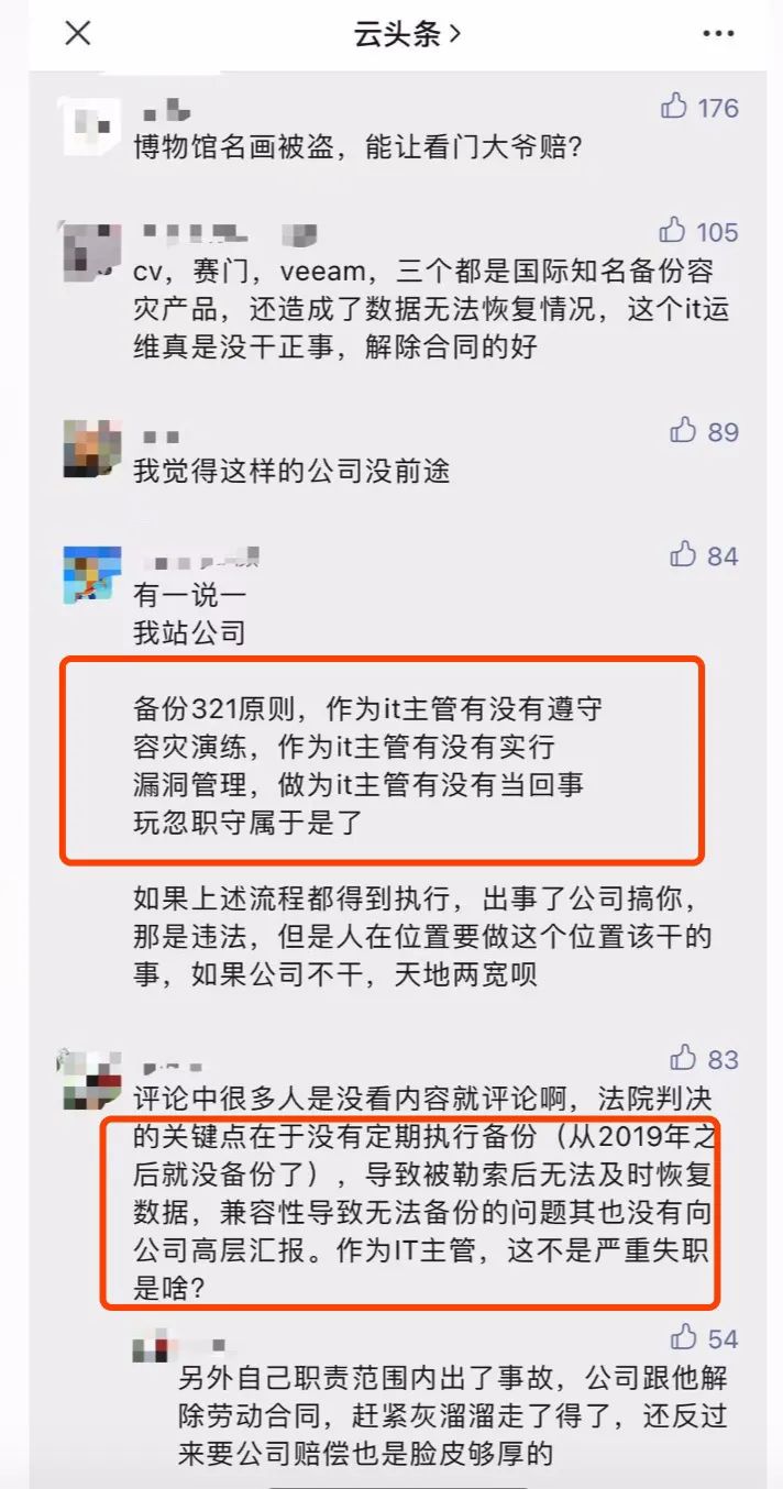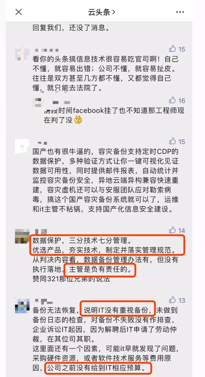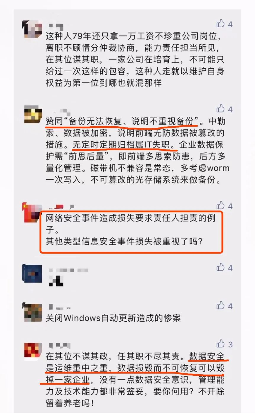 針對該事件,網(wǎng)友們也展開了熱烈的討論,大家紛紛看到了事件中的關(guān)鍵利害關(guān)系:運(yùn)維不受重視、企業(yè)投入不足、IT主管失職等問題是導(dǎo)致事件發(fā)生的主要原因。