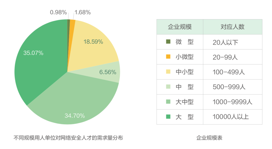 從用人單位規(guī)模維度出發(fā),萬(wàn)人規(guī)模以上大型企業(yè)對(duì)于網(wǎng)安類(lèi)人才需求最高,為35.70%。值得注意的是,百人規(guī)模以上的中型企業(yè)和中小型企業(yè),對(duì)于網(wǎng)絡(luò)安全人才的需求,近三年來(lái)以每年接近3個(gè)百分點(diǎn)的增幅在不斷提高,表明自2019年網(wǎng)絡(luò)安全等級(jí)保護(hù)制度2.0標(biāo)準(zhǔn)正式發(fā)布后提高了對(duì)中小型機(jī)構(gòu)的安全等級(jí),中小企業(yè)、民營(yíng)企業(yè)——經(jīng)濟(jì)社會(huì)中數(shù)量最多的主體的安全需求正在逐步提升。