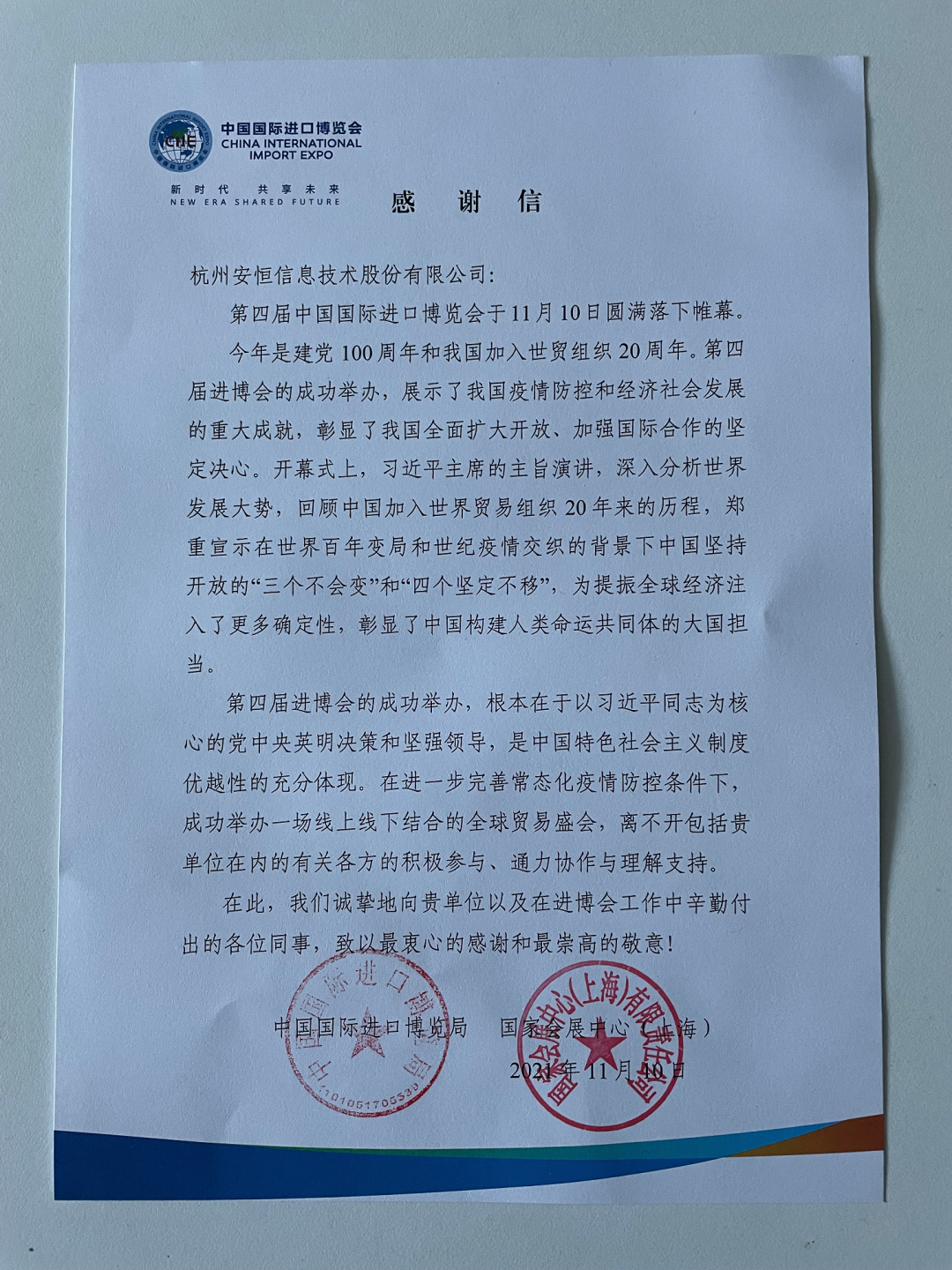 對此,中國國際進(jìn)口博覽局、國家會展中心(上海)有限責(zé)任公司特地發(fā)來感謝信,向安恒信息致以最衷心的感謝和最崇高的敬意!