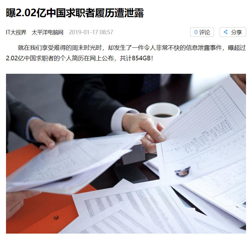 2019年1月,2.02億中國(guó)求職者履歷遭泄露