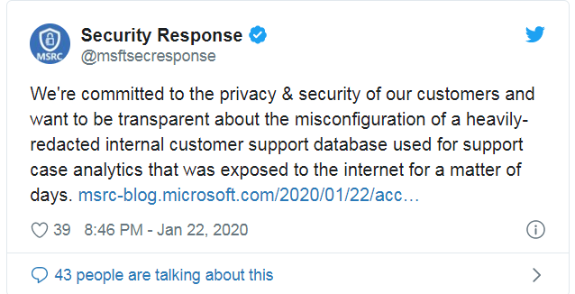 據(jù)微軟發(fā)布的公告稱,數(shù)據(jù)泄露的具體原因是“數(shù)據(jù)庫(kù)網(wǎng)絡(luò)安全組進(jìn)行的更改中含有配置不當(dāng)?shù)陌踩?guī)則”。此次事件曝光了微軟2.5 億條客戶服務(wù)和支持記錄,泄露了客戶郵箱、IP地址、地理位置、CSS聲明等。