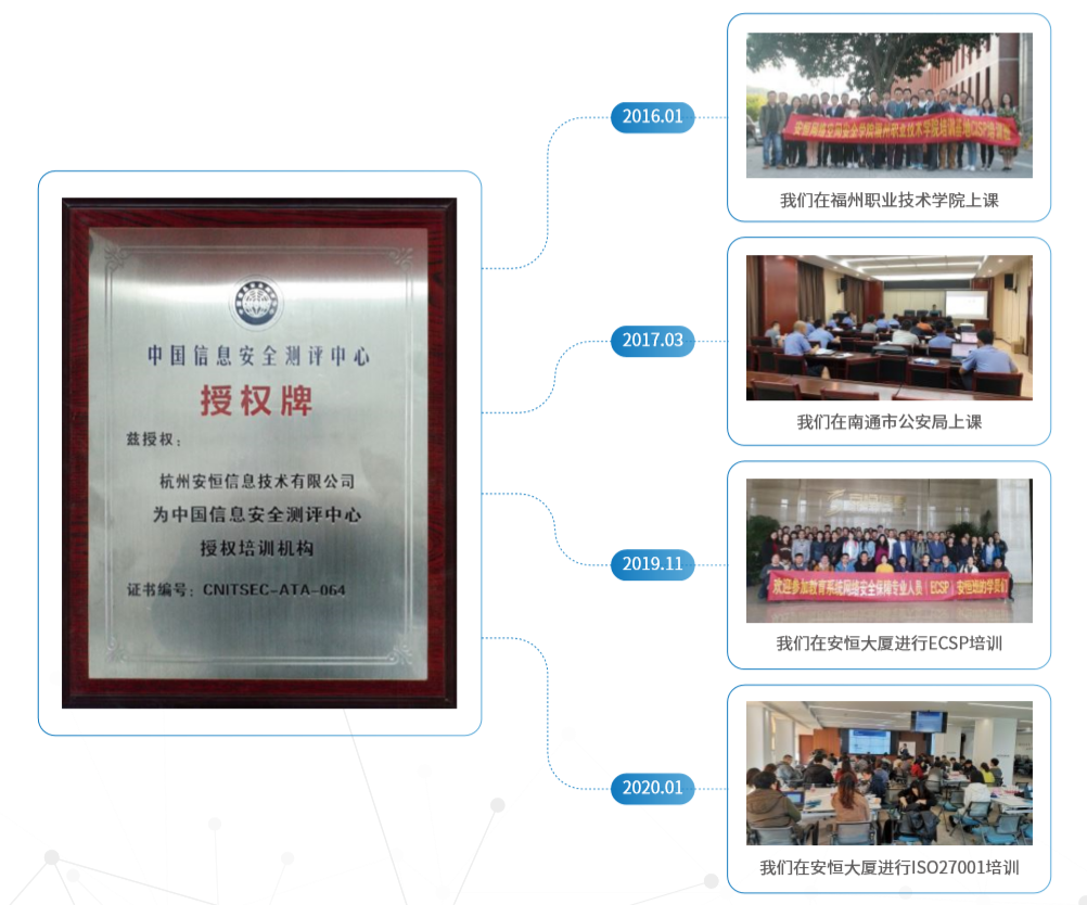 安恒信息憑借在安全領(lǐng)域多年的實(shí)踐經(jīng)驗(yàn)、充足的頂尖信息安全人才儲(chǔ)備以及各種大型信息安全項(xiàng)目的運(yùn)作和管理經(jīng)驗(yàn),獲得了中國(guó)信息安 全測(cè)評(píng)中心頒發(fā)的“授權(quán)培訓(xùn)機(jī)構(gòu)”的安全培訓(xùn)認(rèn)證資質(zhì)。?
