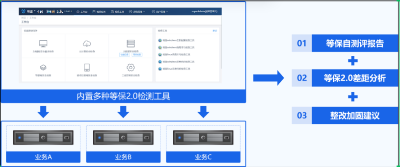 中小型客戶希望有一擊即中的解決方案,免于人力物力財力投入超負荷之苦。等保一體機內(nèi)置特色的等保自測評功能,能夠快速幫助用戶發(fā)現(xiàn)當(dāng)前業(yè)務(wù)系統(tǒng)與等保標(biāo)準(zhǔn)的差距,并為系統(tǒng)安全加固提供針對性建議,讓中小型客戶把錢花在刀刃上,避免無效投入。