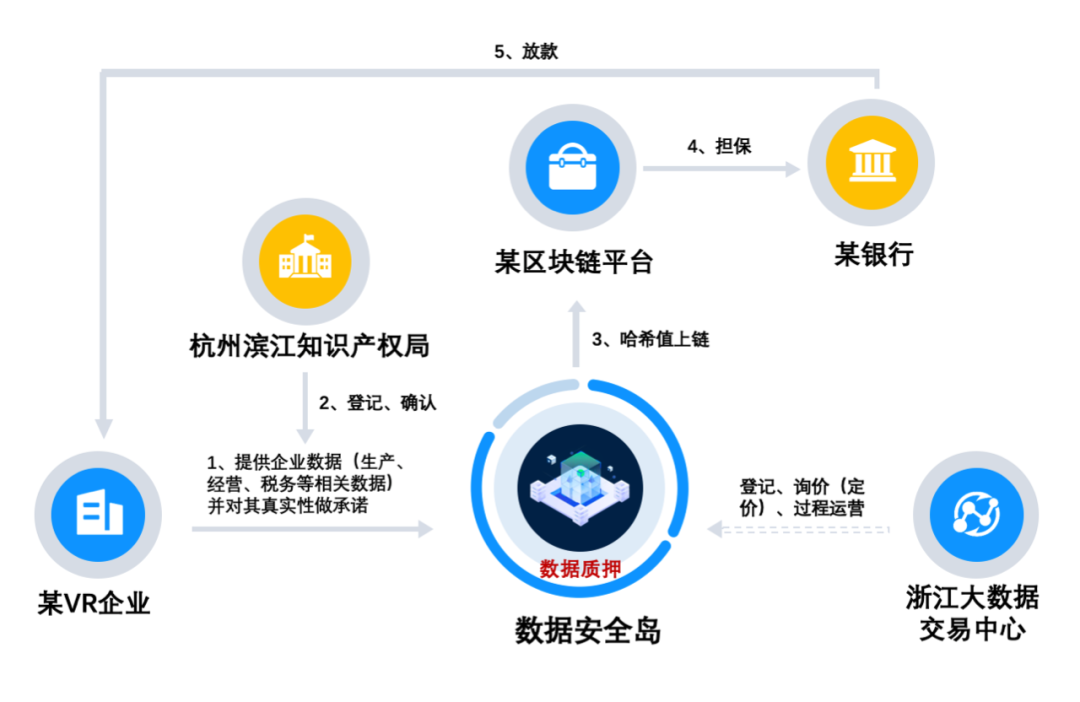 企業(yè)將自身核心數(shù)據(jù)資產(chǎn)質(zhì)押貸款,數(shù)據(jù)加密質(zhì)押在數(shù)據(jù)安全島上,安全島計(jì)算數(shù)據(jù)哈希值并記錄在區(qū)塊鏈中,作為憑證: