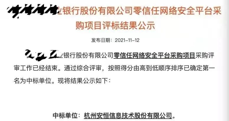 最高得分!安恒信息中標(biāo)某地區(qū)銀行零信任建設(shè)項目
