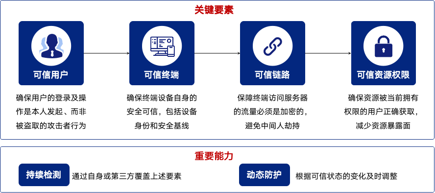 此背景下,零信任被提出來,其核心原則是“Trust no-one. Verify everything”,提倡以身份為邊界作為權(quán)限管控的基礎(chǔ)。進一步講,就是零信任認(rèn)為企業(yè)不應(yīng)該自動信任內(nèi)部或外部的任何人/事/物,應(yīng)在授權(quán)前通過動態(tài)和持續(xù)的身份認(rèn)證和評估機制,對網(wǎng)絡(luò)環(huán)境中的訪問主體人和設(shè)備的危險等級進行科學(xué)準(zhǔn)確判定,采用最小特權(quán)訪問策略,嚴(yán)格執(zhí)行訪問控制,提升所有網(wǎng)絡(luò)實體連接之間的可信關(guān)系,增加企業(yè)安全保障。