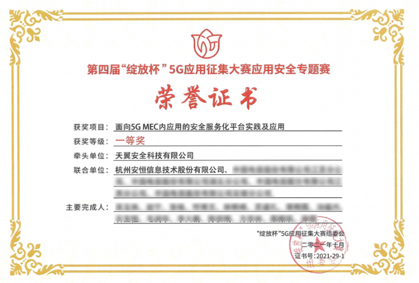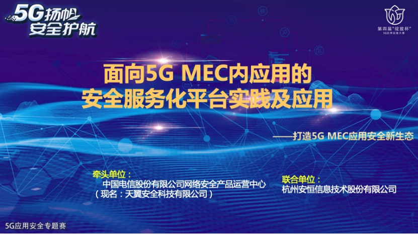 日前,由工業(yè)和信息化部組織的第四屆“綻放杯”5G應(yīng)用征集大賽應(yīng)用安全專題賽結(jié)果出爐,經(jīng)過層層篩選,天翼安全聯(lián)合安恒信息共同打造《面向5G MEC內(nèi)應(yīng)用的安全服務(wù)化平臺(tái)實(shí)踐及應(yīng)用》技術(shù)服務(wù)方案從323個(gè)參賽項(xiàng)目中脫穎而出,榮獲一等獎(jiǎng)。