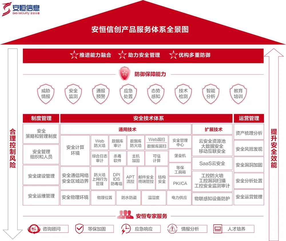 在已有信創(chuàng)產(chǎn)品和規(guī)劃基礎(chǔ)上,安恒信息推出信創(chuàng)整體解決方案。除基礎(chǔ)安全產(chǎn)品外,在云計(jì)算、大數(shù)據(jù)和態(tài)勢感知的安全領(lǐng)域都進(jìn)行了深入研究并形成產(chǎn)品,配合安恒專家服務(wù)有效完善管理制度、運(yùn)維制度推進(jìn)與客戶能力融合;同時(shí)通過威脅情報(bào)、通報(bào)預(yù)警、智能分析等防御保障能力,優(yōu)構(gòu)多重防御合理控制風(fēng)險(xiǎn),提升安全效能,協(xié)助用戶建設(shè)全面的安全體系。