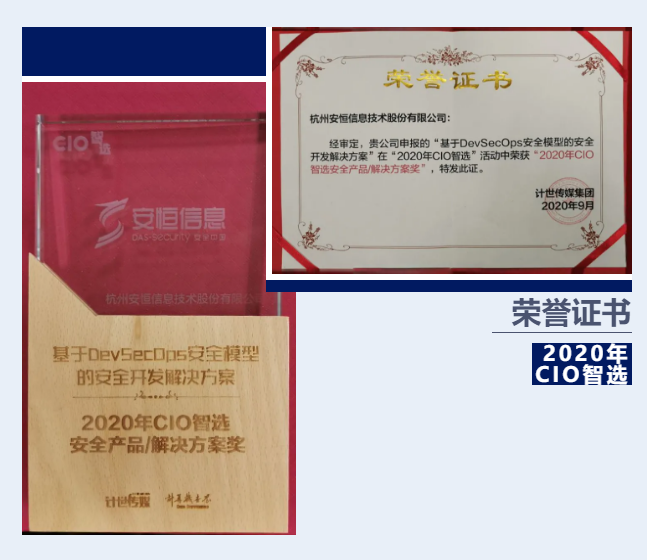 近日,中央專業(yè)媒體集團(tuán)計世傳媒推出了“2020 CIO領(lǐng)航計劃”暨“復(fù)工復(fù)產(chǎn)復(fù)學(xué)”優(yōu)秀案例征集大型活動”。安恒信息憑借DevSecOps安全模型的安全開發(fā)解決方案,榮獲「2020年CIO智選安全產(chǎn)品/解決方案獎」,共同入選的還有華為、釘釘、京東物流等企業(yè)。