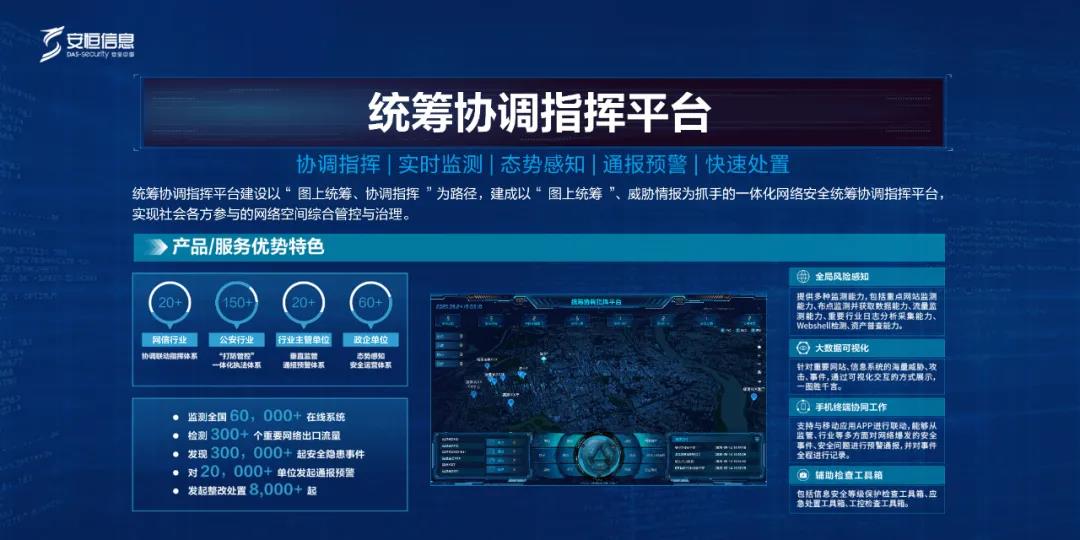 本次成果展,安恒信息在威脅情報(bào)展示區(qū)重點(diǎn)展示了統(tǒng)籌協(xié)調(diào)指揮平臺。該平臺建設(shè)以“圖上統(tǒng)籌、協(xié)調(diào)指揮”為路徑,建成以“圖上統(tǒng)籌”、威脅情報(bào)為抓手的一體化網(wǎng)絡(luò)安全統(tǒng)籌協(xié)調(diào)指揮平臺,實(shí)現(xiàn)社會各方參與的網(wǎng)絡(luò)空間綜合管控與治理。