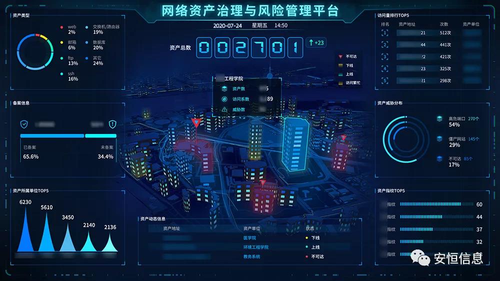 安恒信息網(wǎng)絡資產(chǎn)綜合治理平臺,可以幫助高校在網(wǎng)絡資產(chǎn)的精細化管理上,實現(xiàn)資產(chǎn)可視、可管、可控,從根本上提高智慧校園建設中的網(wǎng)絡風險對抗能力;同時響應政策要求,落實網(wǎng)絡安全責任制,為高校教育信息化的發(fā)展與管理點亮了一束照亮盲區(qū)的光。