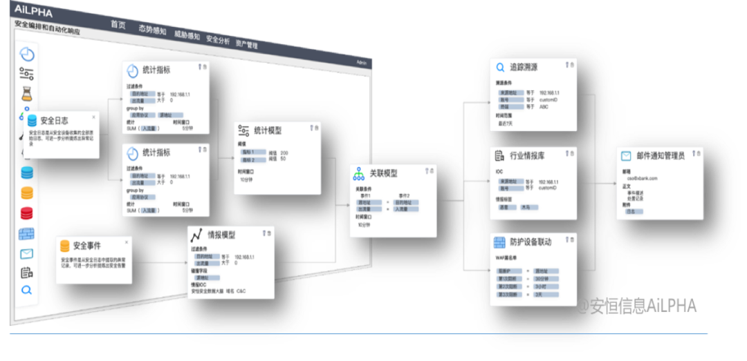 安恒信息AiLPHA大數(shù)據(jù)實(shí)驗(yàn)室根據(jù)對指南的解讀,提出分層解耦的建設(shè)思想,解決方案自上而下分為安全能力應(yīng)用層、安全場景分析層以及安全大數(shù)據(jù)中心三個(gè)層面,利用大數(shù)據(jù)平臺的計(jì)算和智能關(guān)聯(lián)分析能力,實(shí)現(xiàn)對企業(yè)全網(wǎng)安全狀況的智能檢測、深度溯源以及聯(lián)動(dòng)響應(yīng)。