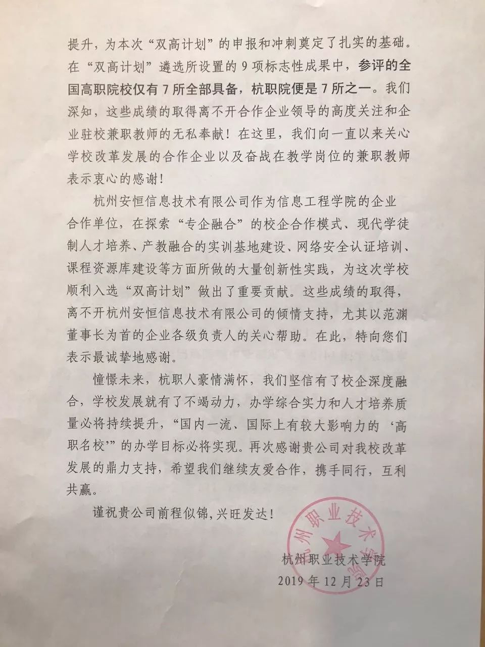 作為安恒信息產(chǎn)學(xué)研合作院校,杭州職業(yè)技術(shù)學(xué)院入選了首批高水平高職學(xué)校B檔建設(shè)單位,正式躋身全國(guó)高職院?!暗谝环疥嚒钡那傲?。自2015年安恒信息和杭州職業(yè)技術(shù)學(xué)院達(dá)成合作關(guān)系后,雙方致力共同探索“專企融合”的校企合作模式、現(xiàn)代學(xué)徒制人才培養(yǎng)、產(chǎn)教融合的實(shí)訓(xùn)基地建設(shè)、網(wǎng)絡(luò)安全認(rèn)證培訓(xùn)、課程資源庫(kù)建設(shè)等方面所做出的大量創(chuàng)新性實(shí)踐,助力杭州職業(yè)技術(shù)學(xué)院順利入選“雙高計(jì)劃”。