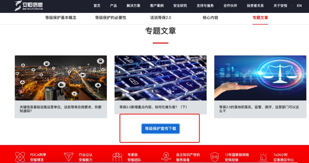 2、 后臺回復(fù)“等保2.0”,進去安恒信息官網(wǎng)“等級保護2.0專題”。了解詳情,亦可下載等級保護2.0宣傳手冊。