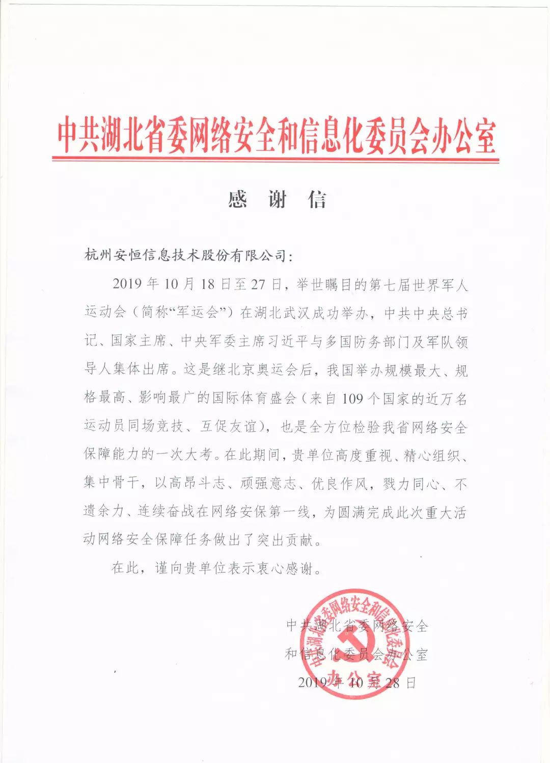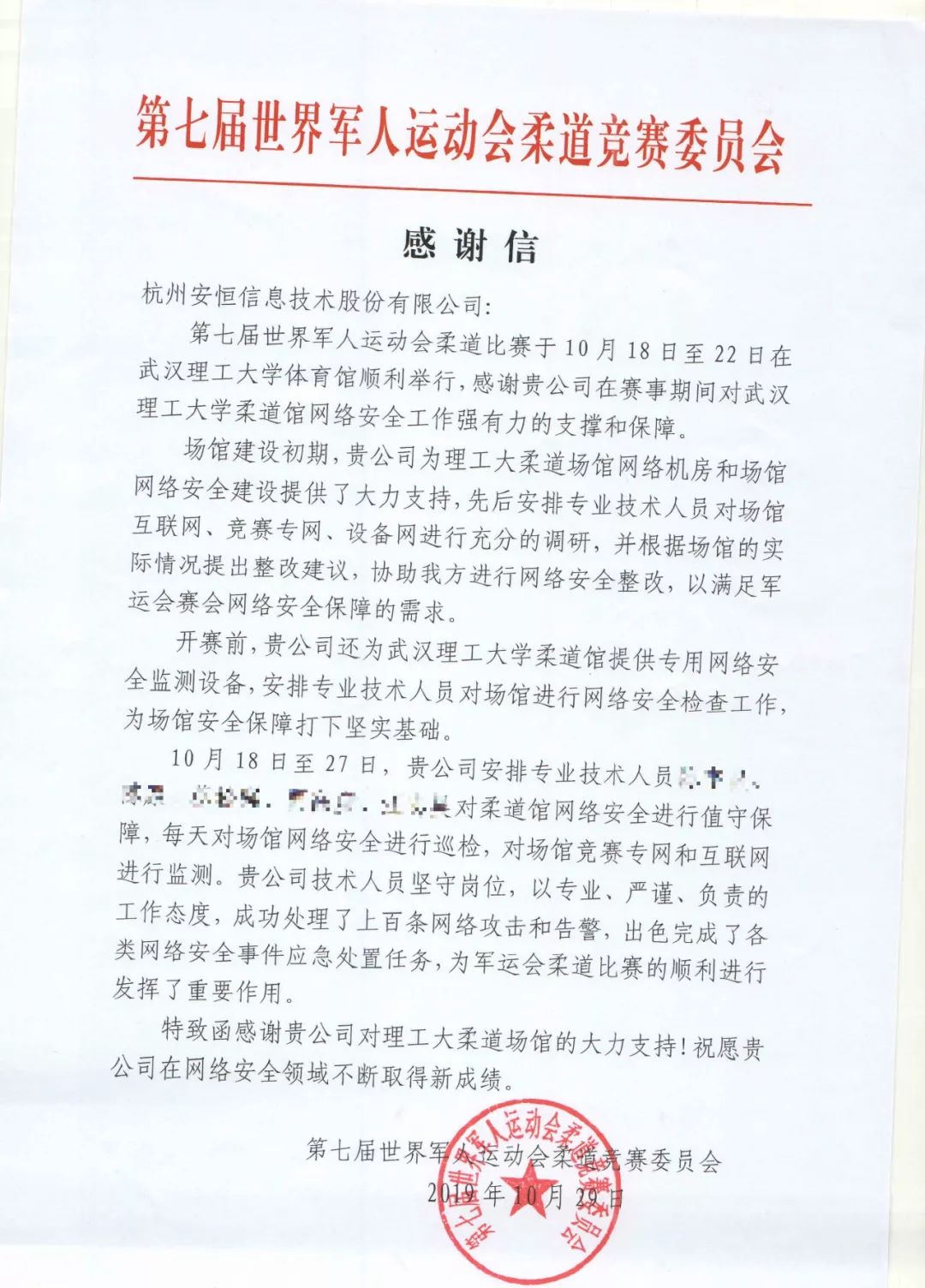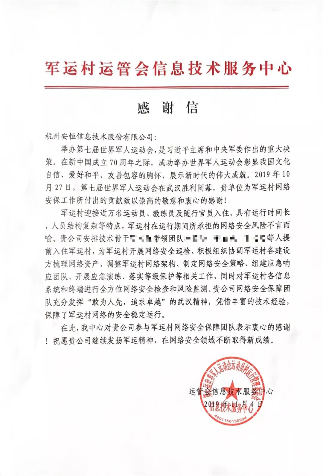 安恒信息收到了一波來(lái)自武漢軍運(yùn)會(huì)的感謝信