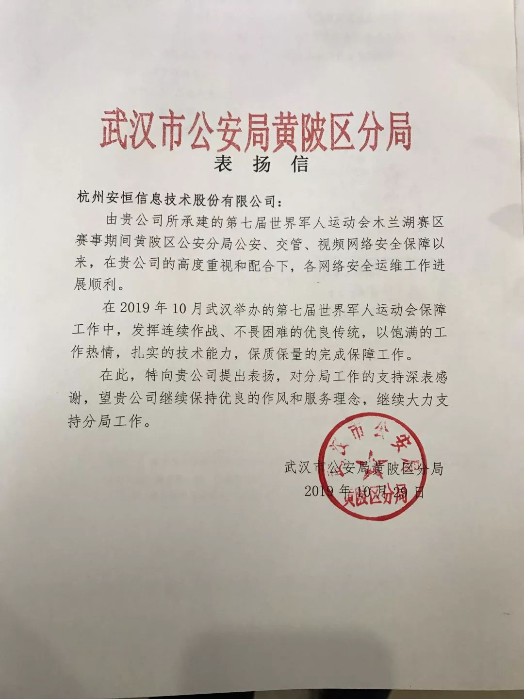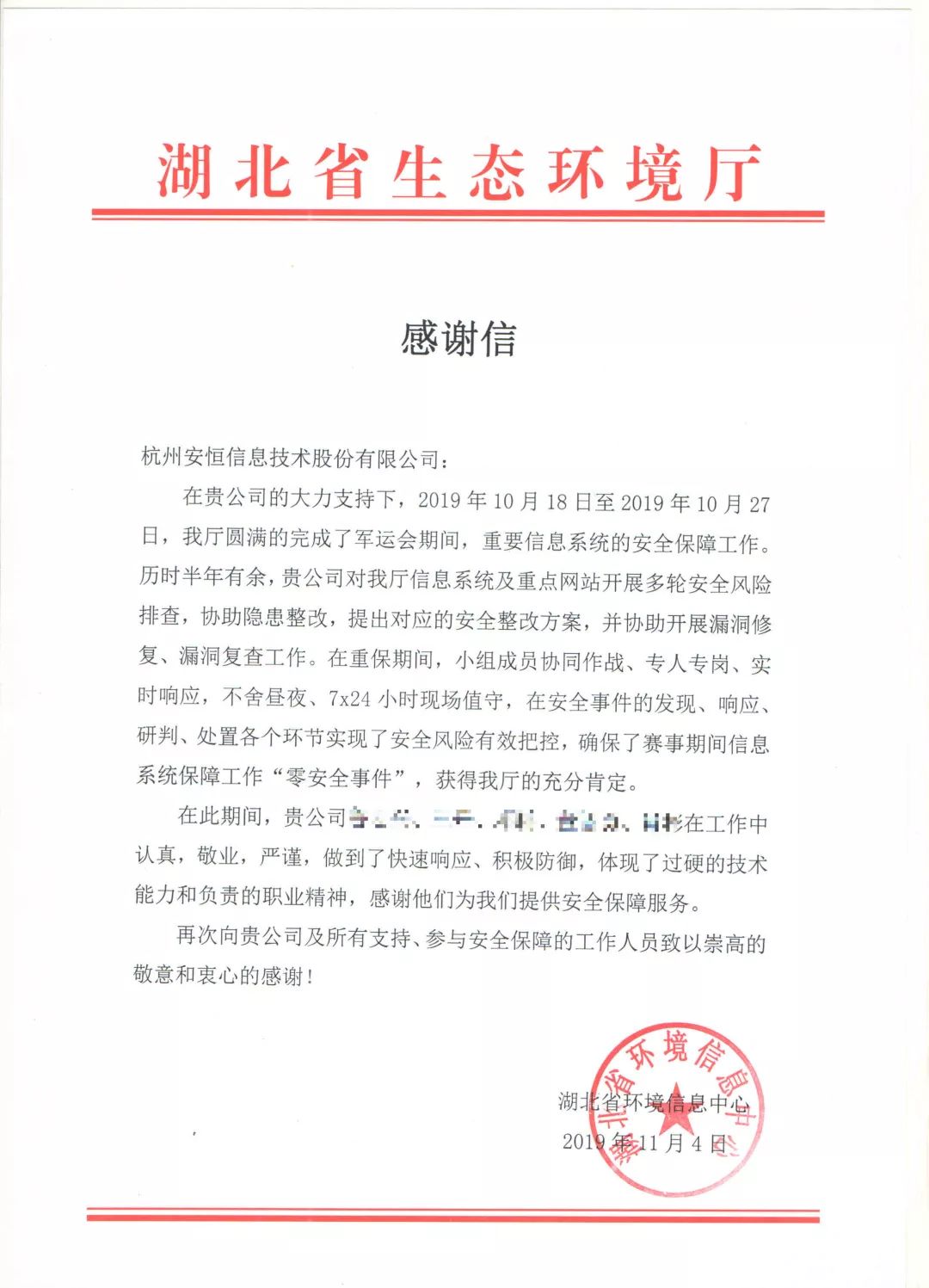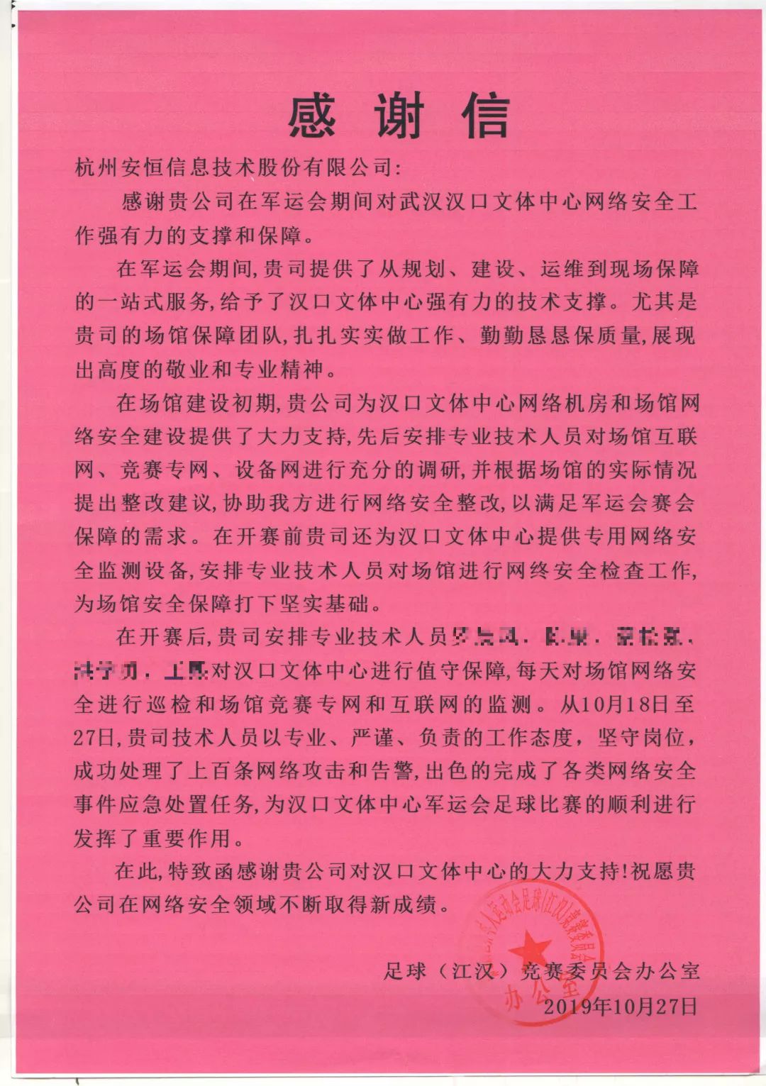 安恒信息收到了一波來(lái)自武漢軍運(yùn)會(huì)的感謝信